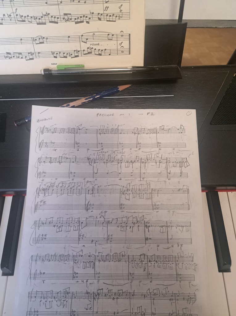 After that first pass, I found myself (eerily) satisfied, but not entirely convinced. What followed was the “sculpting” phase: careful erasures, octave displacements of entire phrases, subtle rhythmic adjustments. By the end, the finished piece bore almost no resemblance to the original sketch (see photo)
